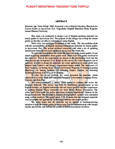 Purnomo, Ignatius Gelar Setiaji (2008) Designing a set of english speaking materials for tourist guides at Agrowisata Turi. Skripsi thesis, Sanata Dharma University.